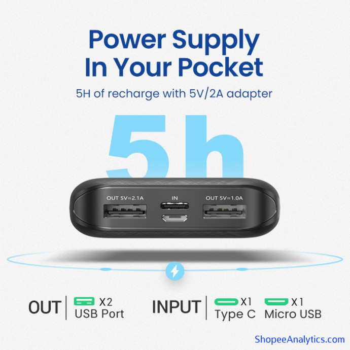 PIN SẠC DỰ PHÒNG: Thiết kế đầu vào USB-C và micro USB, kích thước nhỏ hỗ trợ đầu vào nguồn tối đa 5V 2A, mất khoảng 5 giờ để sạc đầy pin dự phòng bằng bộ nguồn 2A, sạc qua cổng USB-C hoặc Micro USB sẽ tốn nhiều thời gian hơn.