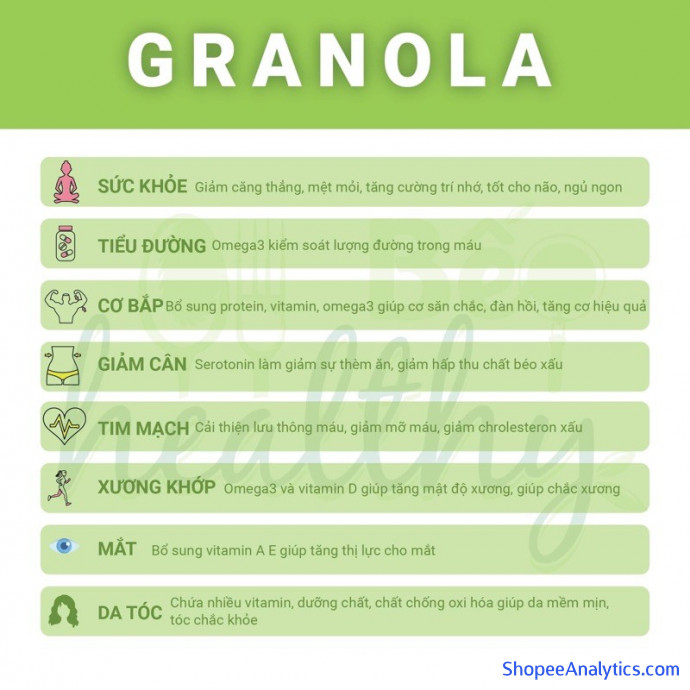• Ngũ cốc Granola cung cấp nguồn chất xơ dồi dào giúp no lâu, ngăn ngừa sự tích tụ mỡ thừa.