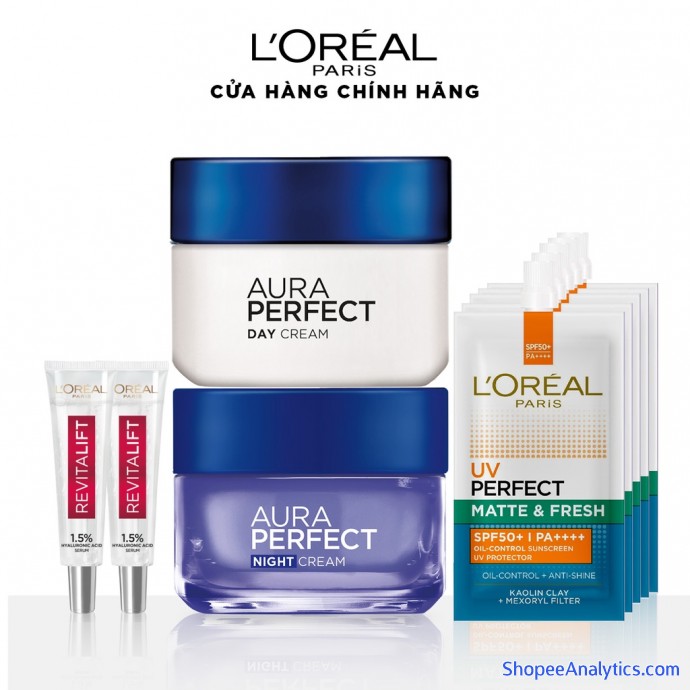 Bộ Dưỡng Trắng và siêu cấp ẩm căng mịn da L'Oreal Paris Aura Perfect WP Day Night & 2 HA 7.5 & 4 UV Sachet