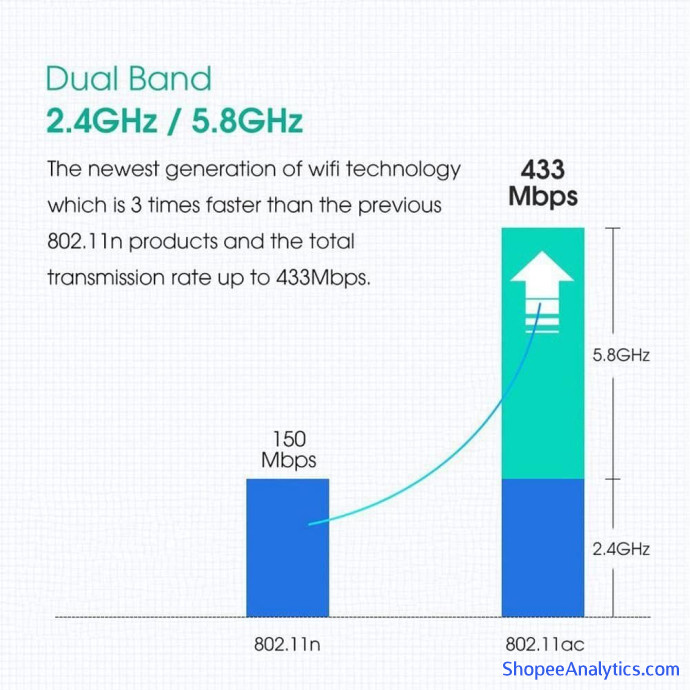 Tốc độ truyền: 600Mbps (11N: 150Mbps, 11AC: 433Mbps)