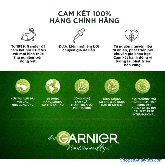 Garnier là thương hiệu làm đẹp từ thiên nhiên số 1 thế giới, chuyên sâu về chăm sóc và bảo vệ sức khỏe làn da. Là sự hòa quyện tuyệt vời giữa từ hơn 90% chiết xuất nguyên liệu từ thiên nhiên và công nghệ khoa học đột phá – Green Labs, được kiểm nghiệm bởi chuyên gia da liễu, Garnier cung cấp những giải pháp có hiệu quả vượt trội đã được chứng minh hoàn toàn lành tính & an toàn, chăm sóc da của bạn khỏe đẹp từ bên trong.