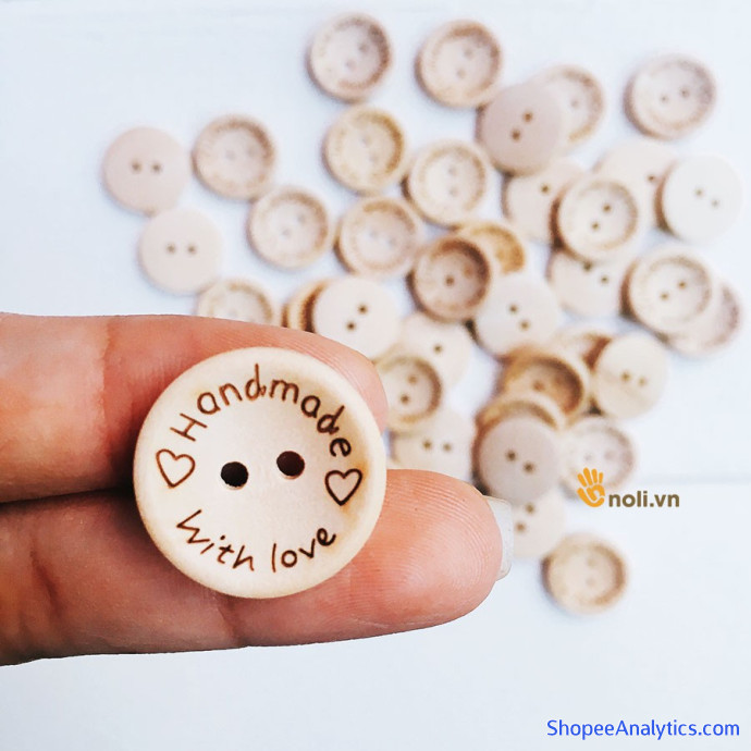Cúc bằng gỗ có in chữ HANDMADE WITH LOVE rõ nét, màu sắc vintage độc đáo, dùng để trang trí các sản phẩm handmade như áo, khăn, mũ, thú bông...