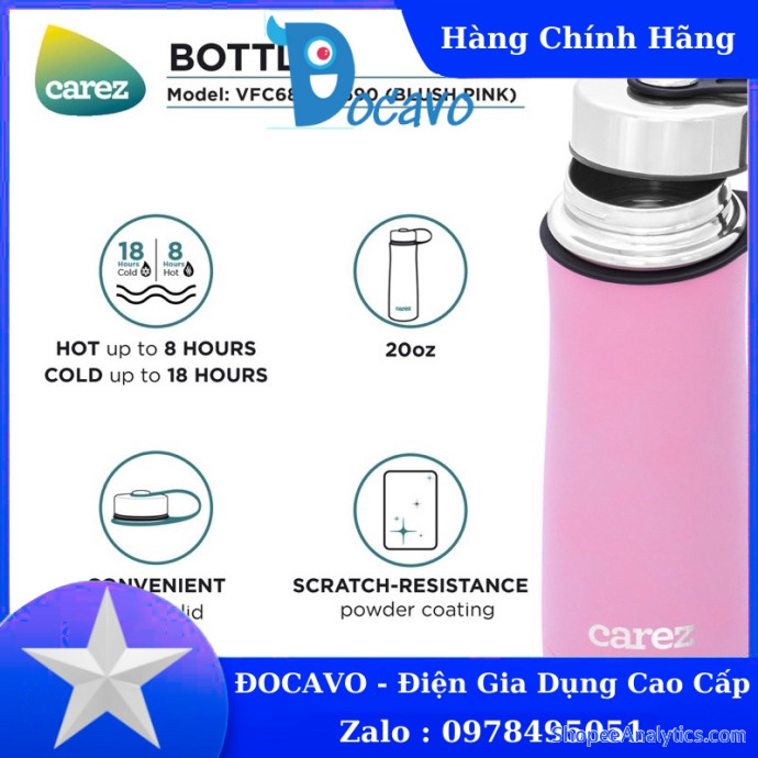- Bình giữ nhiệt Carez model VFC688SP-590 với màu hồng san hô trẻ trung, tươi tắn, thiết kế nắp dạng xoay có quai xách thanh lịch, tiện lợi để treo móc và mang đi, phù hợp để đồng hành cùng bạn khi vận động và thể dục thể thao mỗi ngày.