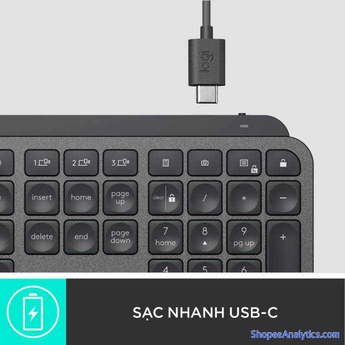 MX Keys có thể sử dụng trong 10 ngày sau khi sạc đầy hoặc tới 5 tháng khi không sử dụng đèn. Bàn phím sử dụng cáp sạc USB-C.