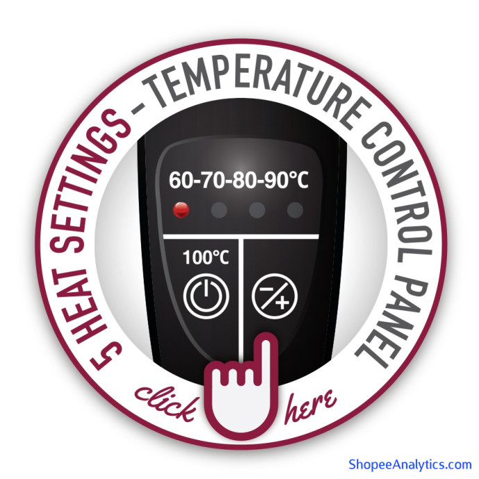 Điều khiển điện tử nằm trên tay cầm với hai chức năng: đun sôi ở 4 mức nhiệt độ khác nhau tùy nhu cầu sử dụng (60°, 70°, 80°, 90°).