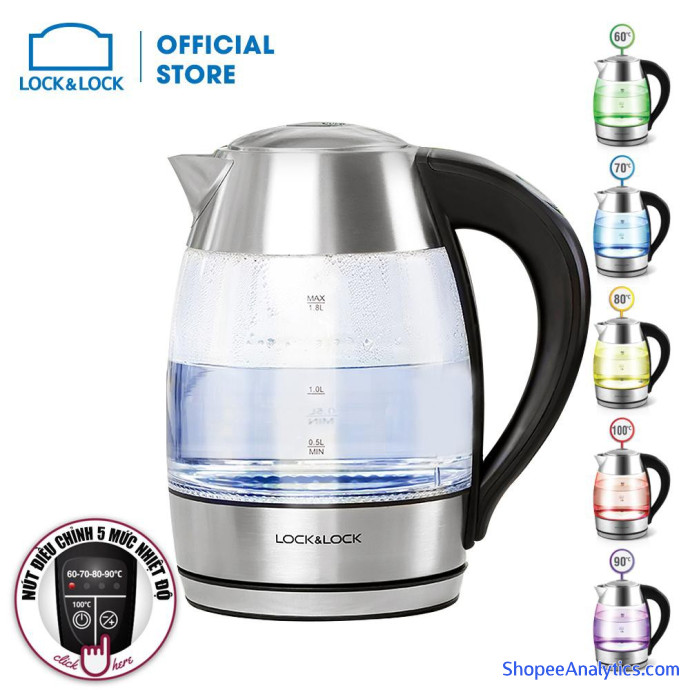 Ấm đun nước dùng điện ĐỔI MÀU bằng thủy tinh, hiệu Lock&Lock 1.8L, 220-240V, 50/60Hz, 1850-2200W EJK341
