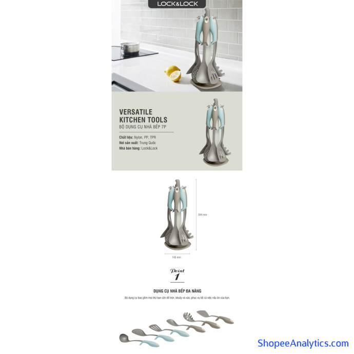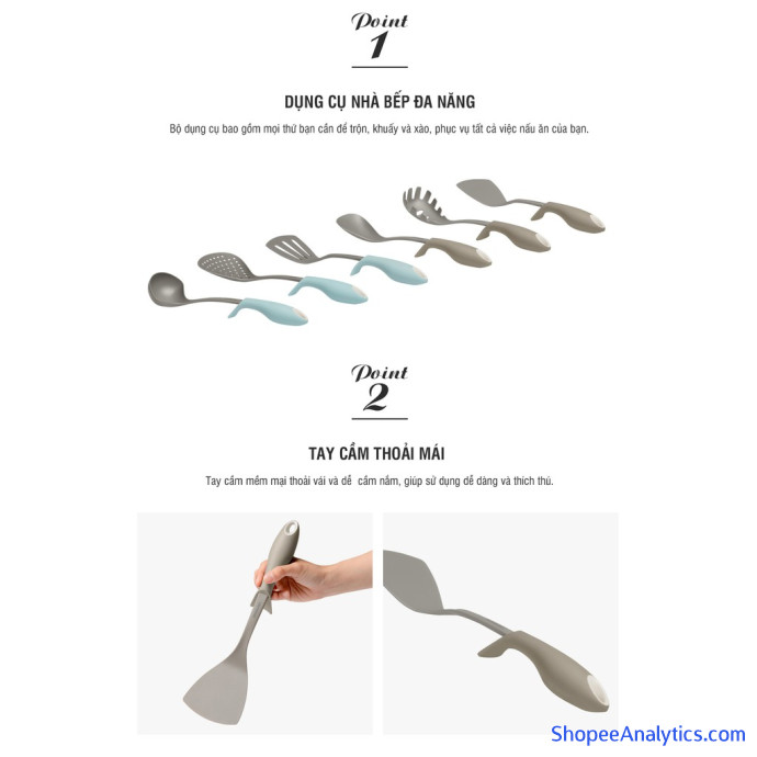Bộ dụng cụ bao gồm 7 món dùng trong nhà bếp với 6 vá và 1 dụng dụng để treo vá tiện dụng, giúp cho bạn linh hoạt sử dụng trong gian bếp nhà mình