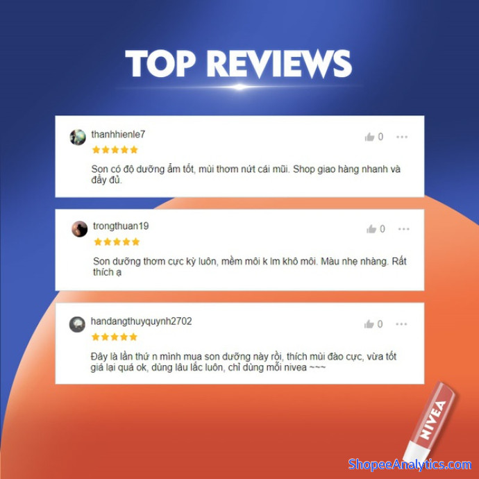 Tổng thể Son dưỡng ẩm Nivea sắc cam hương đào Peach Shine (4.8g) - 85031 được đánh giá trung bình 4.95/5 điểm dựa vào 4,709 đánh giá qua 9,814 lượt mua hàng (Cập nhập ngày 18/10/2021).