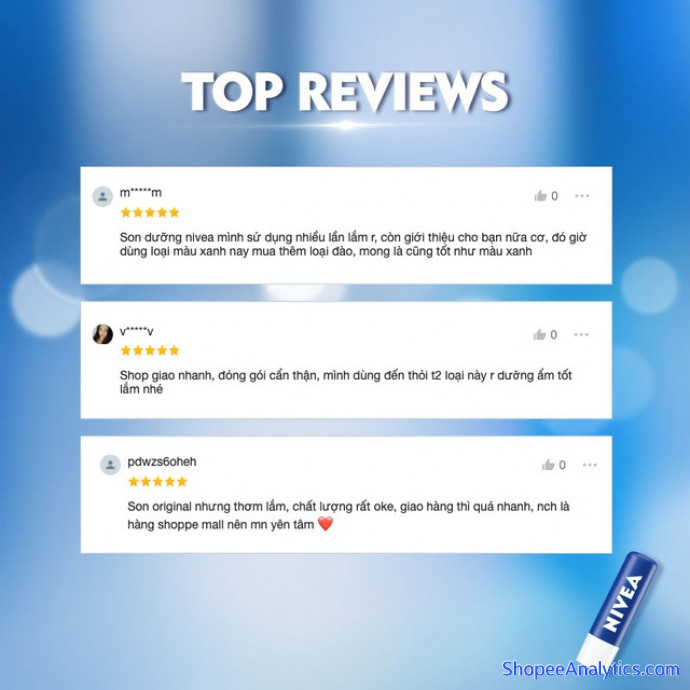Tổng thể Son dưỡng ẩm chuyên sâu Nivea Original Care (4.8g) - 85061 được đánh giá trung bình 4.95/5 điểm dựa vào 3,017 đánh giá qua 6,909 lượt mua hàng (Cập nhập ngày 18/10/2021).