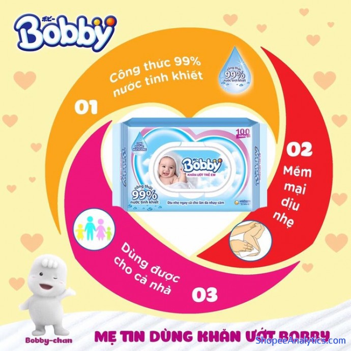 Khăn ướt Bobby là sản phẩm chăm sóc trẻ em của Tập đoàn Unicharm - Nhật Bản. Hơn 40 năm qua, sản phẩm chăm sóc trẻ em của Unicharm đồng hành cùng hàng triệu em bé Nhật Bản từ những ngày đầu tiên chào đời, và tự hào được lựa chọn là nhà sản xuất tã lót em bé số 1 tin dùng bởi các bà mẹ Nhật. Nay, sản phẩm khăn ướt trẻ em được phát triển ứng dụng công nghệ của nhà dẫn đầu, Bobby cam kết đem đến sự thoải mái, an toàn và nâng niu tối đa cho bé yêu - như vòng tay âu yếm của mẹ.