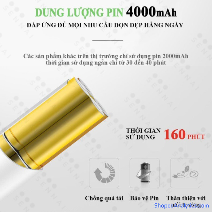 CHỔI CỌ NHÀ VỆ SINH BỒN CẦU TOILET KHÔNG DÂY ĐA NĂNG SENNAI sử dụng công nghệ pin Lithium thân thiện với môi trường, dung lượng cức lớn lên đến 4000mAh giúp bạn thỏa sức dọn dẹp nhà cửa chỉ với 1 lần xạc. Thời gian sử dụng của Cây Chà Điện Vệ Sinh Làm Sạch Nhà Cửa Đa Năng SENNAI lên đến 160 phút (không tải), 90 - 100 phút khi sử dụng liên tục thoải mái đáp ứng mọi nhu cầu hằng ngày. Chuẩn kháng nước IPX4 kết hợp động cơ điện không chổi than giúp máy không bị nóng lên trong quá trình sử dụng cũng như kéo dài tuổi thọ của sản phẩm lên tới 5 năm. Tốc độ quay 320 vòng/1 phút đáp ứng đủ nhu cầu dọn dẹp hằng ngày, với tốc độ quay ổn định, nước sẽ không bị văng lên mỗi khi cọ rửa, hạn chế vết bẩn bắn lên người. Lực nén môtơ cực đại 7,5kg (tương đương việc bạn sử dụng ngón tay trỏ đè thẳng vào cân đồng hồ và kim hiển thị mức 7,5kg - cân 100kg) thì máy sẽ tự động ngắt để bảo vệ động cơ chống quá tải. Cấu tạo hợp lý giúp người sử dụng để dàng thao tác, tốc độ xoay cùng như lực nén môtơ vừa đủ giúp nước không bị văng tung tóe lên người sử dụng.