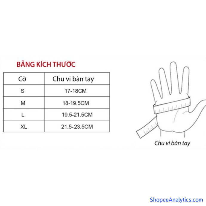 - Người dùng đo chu vi của lòng bàn tay để lựa chọn size: - Size S: < 18 cm - Size M: 18 - 19.5 cm - Size L: 19 - 21,5 cm - Size XL: 21,5 - 23,5 cm