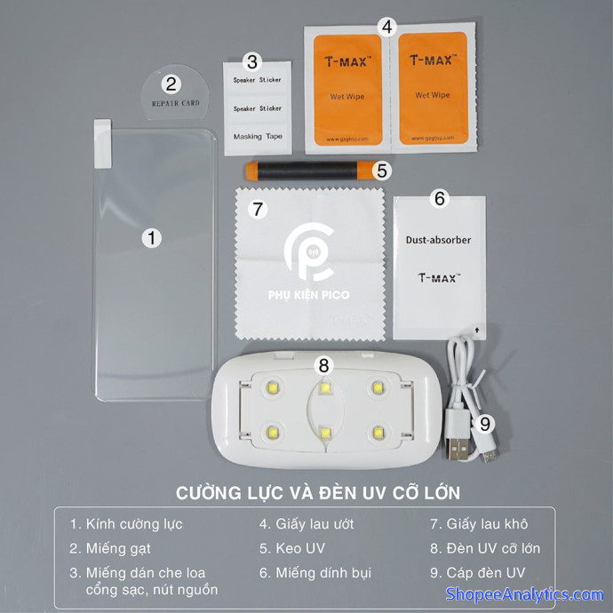 -> Cường lực T-Max full box: Sản phẩm nguyên hộp đầy đủ phụ kiện và ĐÈN UV CỠ LỚN giúp hong khô keo UV nhanh hơn, giúp quá trình tự dán dễ dàng hơn.