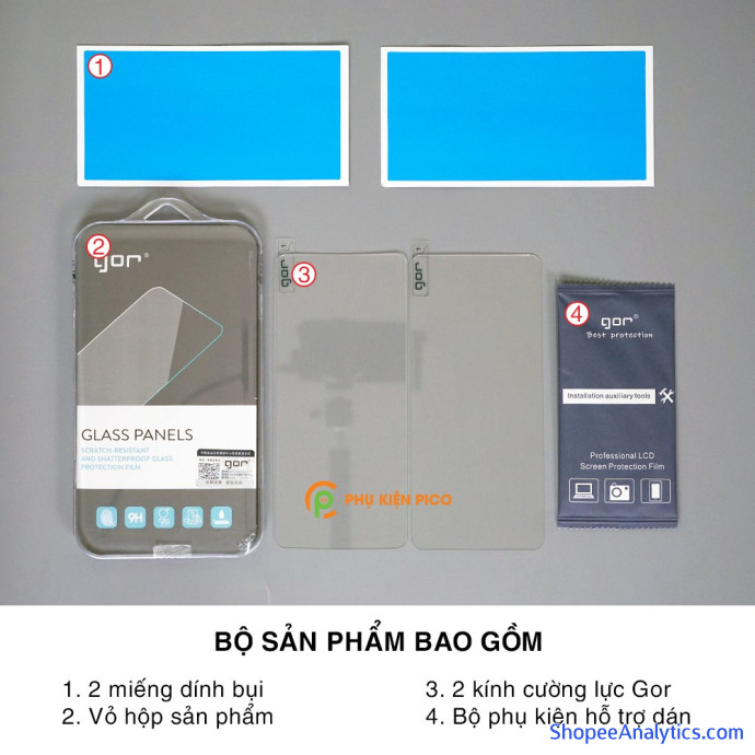 • Bộ sản phẩm nguyên box gồm có: 1 HOẶC 2 HOẶC 3 miếng kính cường lực Gor + Tặng kèm (lọ dầu chống hở viền, giấy lau khô, giấy lau ướt, miếng dính bụi, giấy hướng dẫn dán).