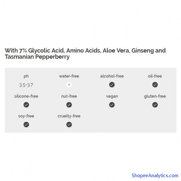 • Thành phần chính chứa Glycolic acid (AHA) làm bề mặt da mềm mại hơn, giảm thiểu sự tồn tại của các nếp nhăn, giúp tẩy da chết trên bề mặt da cũng như làm mờ các vết thâm, nám, giúp da giữ nước, tăng độ đàn hồi khiến da trông trẻ hơn và hoạt động khoẻ hơn; Tasmanian Pepperberry và chiết xuất nhân sâm, nha đam làm dịu da, giảm kích ứng.
