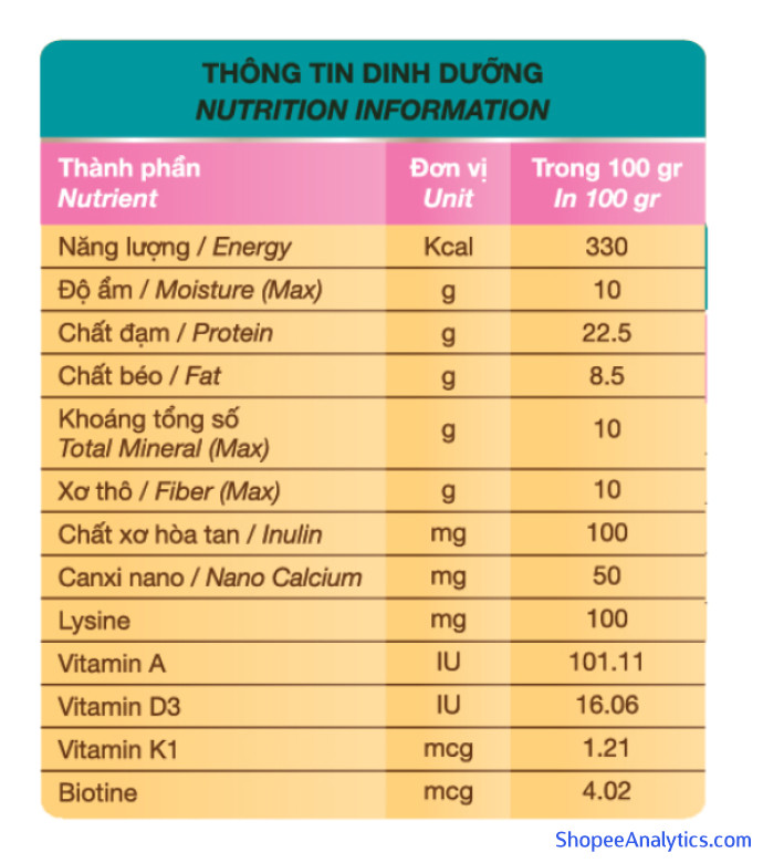 Corn, starch, meat and bone powder, soybean powder, vegetable oil, corn starch, inulin, nano – precipitated calcium carbonate, vitamin D3, vitamin A, vitamin K1, biotine, sorbic acid, antioxydants, clorua natri, food flavor and food color.