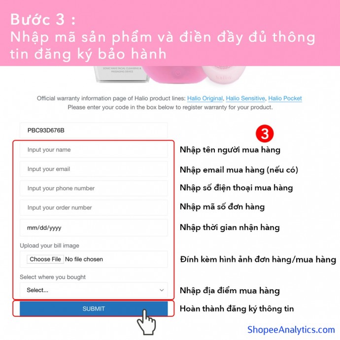 - Bước 2: Nhập mã sản phẩm và điền đầy đủ thông tin đăng ký bảo hành