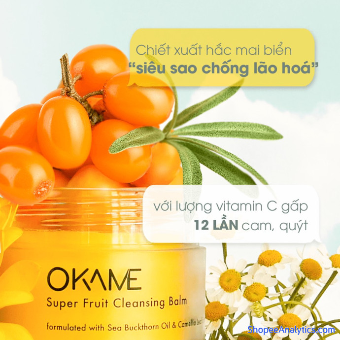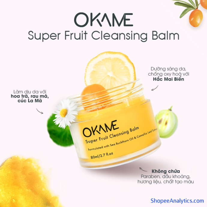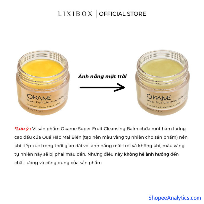 *Lưu ý : Vì sản phẩm Okame Super Fruit Cleansing Balm chứa một hàm lượng cao dầu của Quả Hắc Mai Biển (tạo nên màu vàng tự nhiên cho sản phẩm) nên khi tiếp xúc trong thời gian dài với ánh nắng mặt trời và không khí, màu vàng tự nhiên này sẽ bị phai màu dần. Nhưng điều này không hề ảnh hưởng đến chất lượng và công dụng của sản phẩm.