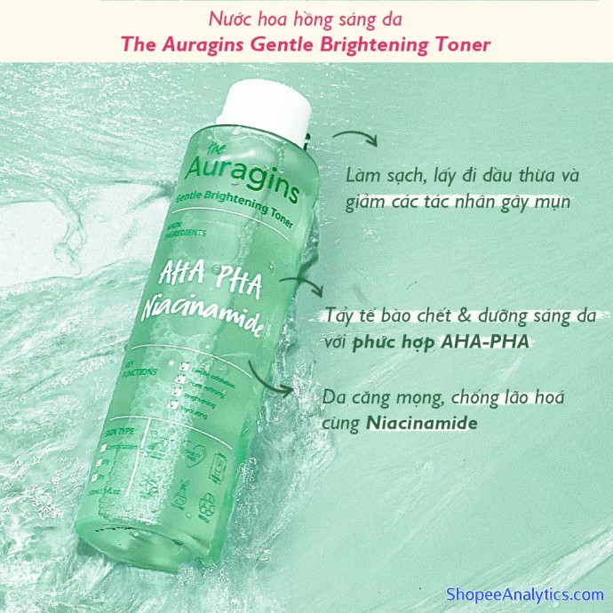 Nước hoa hồng The Auragins Gentle Brightening Toner là một trong những sản phẩm có khả năng làm sạch sâu, lấy đi tế bào chết cũng như lượng dầu thừa trên da giúp da trắng sáng dần và giảm các tác nhân gây mụn theo mỗi lần sử dụng. Đồng thời giúp da hấp thu tốt hơn các dưỡng chất của các kem dưỡng ở các bước tiếp theo của chu trình skincare.