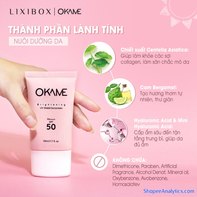 Với bảng thành phần nói không với Demithicone, cồn khô, paraben, dầu khoáng, kem chống nắng Okame Brightening UV Shield an toàn cho các làn da từ thông thường đến nhạy cảm.
