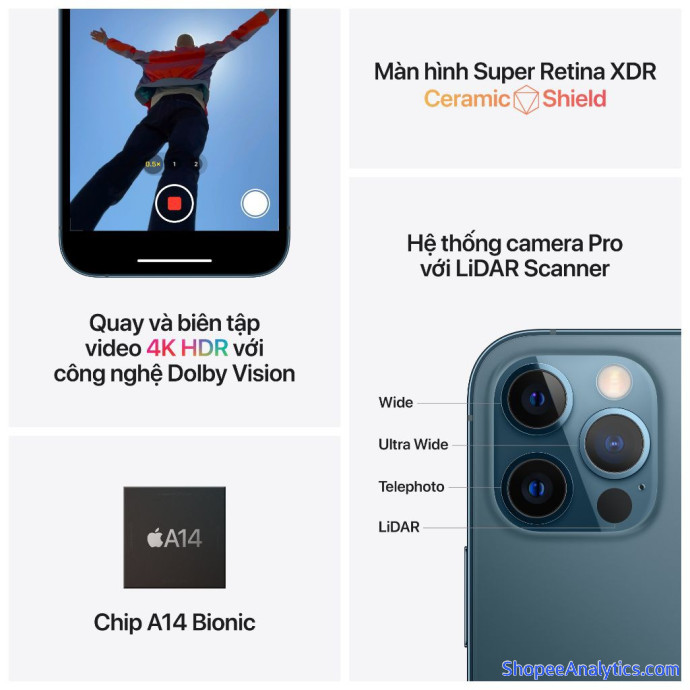 iPhone 12 Pro Max. Màn hình Super Retina XDR 6.7 inch lớn hơn (1). Ceramic Shield với khả năng chịu va đập khi rơi tốt hơn gấp 4 lần (2). Ảnh chụp tuyệt đẹp trong điều kiện ánh sáng yếu với hệ thống camera chuyên nghiệp tuyệt đỉnh trên iPhone và phạm vi thu phóng quang học 5x. Quay phim, biên tập và phát video Dolby Vision đẳng cấp điện ảnh. Chụp ảnh chân dung ở chế độ Ban Đêm và trải nghiệm thực tế ảo tăng cường đẳng cấp mới với LiDAR Scanner. Chip A14 Bionic mạnh mẽ. Cho bất tận những năng lực ấn tượng.