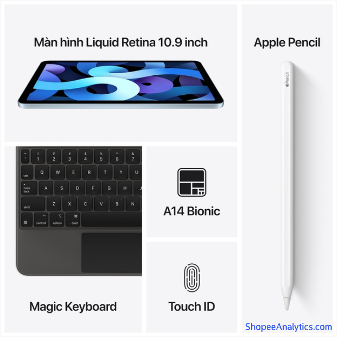 iPad Air hoàn toàn mới. Linh hoạt hơn bao giờ hết. Màn hình Liquid Retina 10.9 inch sắc nét với dải màu rộng cho bạn trải nghiệm thị giác vô cùng sống động và chi tiết khi xem ảnh hay video cũng như khi chơi game trên thiết bị.1 Chip A14 Bionic tích hợp công nghệ Neural Engine nổi bật với hiệu năng vận hành mạnh mẽ và các tính năng máy học cao cấp, hỗ trợ tối đa tác vụ biên tập video 4K, soạn tập tin thuyết trình đẹp mắt hay thiết kế mô hình 3D - mọi tác vụ thật dễ dàng. Thiết bị giờ đã hỗ trợ Magic Keyboard và Apple Pencil (thế hệ thứ 2),2 Touch ID nhanh nhạy, dễ sử dụng, bảo mật cao, camera sau 12MP và camera FaceTime HD 7MP, cổng kết nối USB-C hỗ trợ sạc và phụ kiện, thời lượng pin bền bỉ cả ngày,3 công nghệ Wi-Fi 6 và LTE Gigabit cực nhanh.4 Với iPad Air trong tay, bạn được sở hữu một công cụ vô cùng mạnh mẽ, đủ sức hiện thực hóa mọi ý tưởng của bản thân.