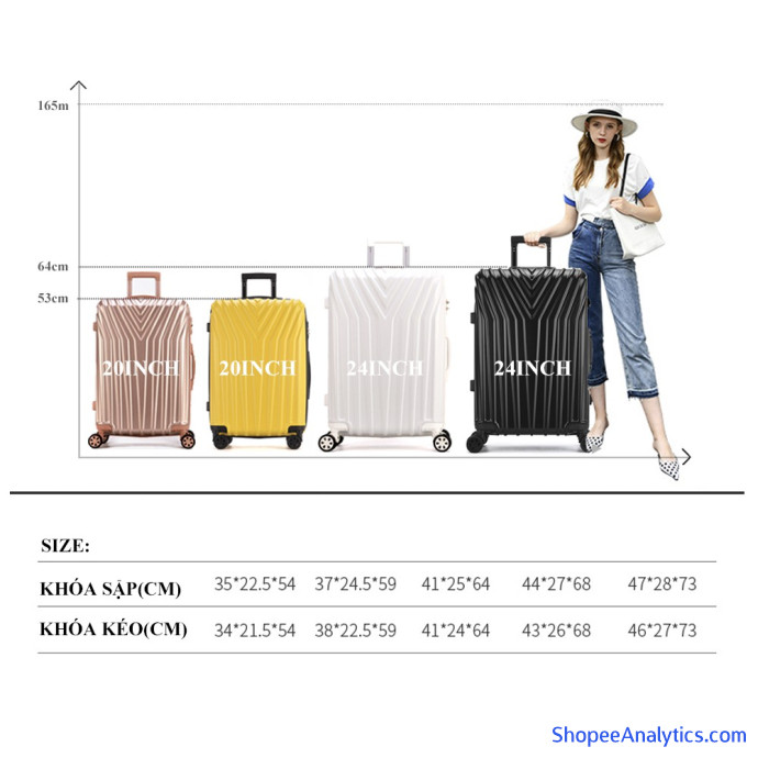 • Size 20: 36.5cm x 25.5cm x 53cm(+/- 2cm), có thể xách tay lên máy bay, sức chứa 7-12kg hành lý, thích hợp cho những chuyến du lịch ngắn ngày 2-4 ngày hoăc đi công tác.