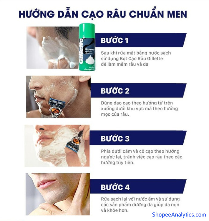 Để chai thẳng đứng rồi xịt ra tay và thoa lên mặt để tạo một lớp bọt mịn rồi bắt đầu cạo râu