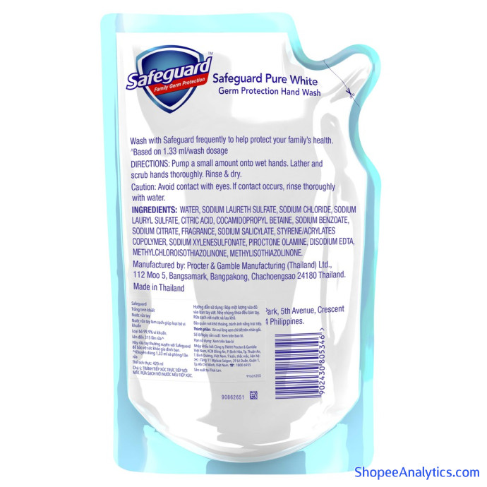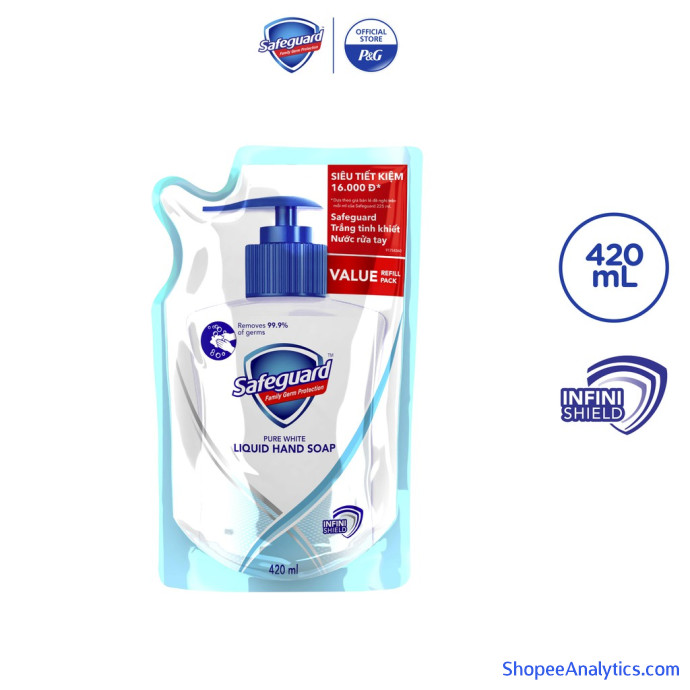 1. Safeguard Trắng tinh khiết Nước rửa tay bảo vệ khỏi vi khuẩn 420ml dạng túi