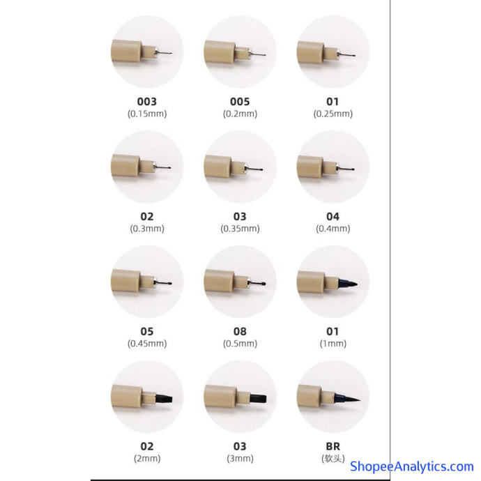 Kích thước: 005 (0.2mm), 01 (0.25mm), 02 (0.3mm), 03 (0.35mm), 04 (0.4mm),05 (0.45mm), 08 (0.5mm), Brush, Graphic