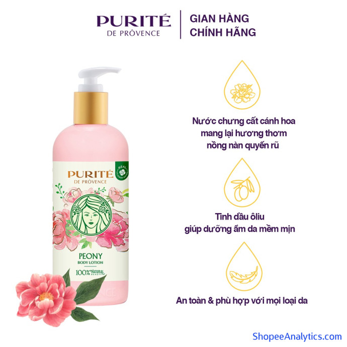 Sữa Dưỡng Thể Purité Thư Giãn Hoa Mẫu Đơn chứa tinh dầu hoa mẫu đơn tự nhiên và dầu ôliu giúp da mềm mịn và lưu lại hương hoa nồng nàn quyến rũ trên làn da tự nhiên của bạn.