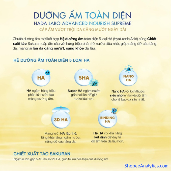 - Hada Labo Advanced Nourish Supreme với hệ dưỡng ẩm toàn diện từ 5 loại Hyaluronic Acid kết hợp cùng chiết xuất tảo Sakuran giúp đẩy nhanh quá trình cấp ẩm đến các lớp biểu bì, nuôi dưỡng và phục hồi màng ẩm tự nhiên, tăng cường độ đàn hồi, nâng đỡ các tầng da, cho một làn da luôn căng mướt, sáng khỏe.