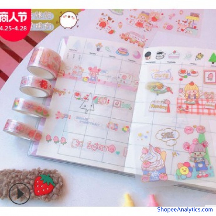 sản phẩm gồm 1 hộp có 5 cuộn dán. 8 tờ sticker dán trang trí.